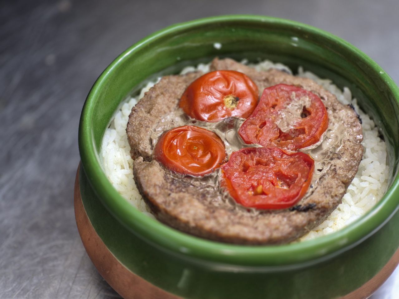 کباب تابهای گوشت مخلوط گوساله و گوسفندی 250 گرمی، 200 گرم برنج ایرانی، گوجه، ارسال در گمج سفالی